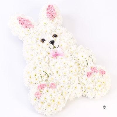 This sweet floral tribute in the shape of a rabbit features fresh white double spray chrysanthemums and contrasting pink spray carnations.  It is trimmed with a matching pale pink ribbon and green steel grass.